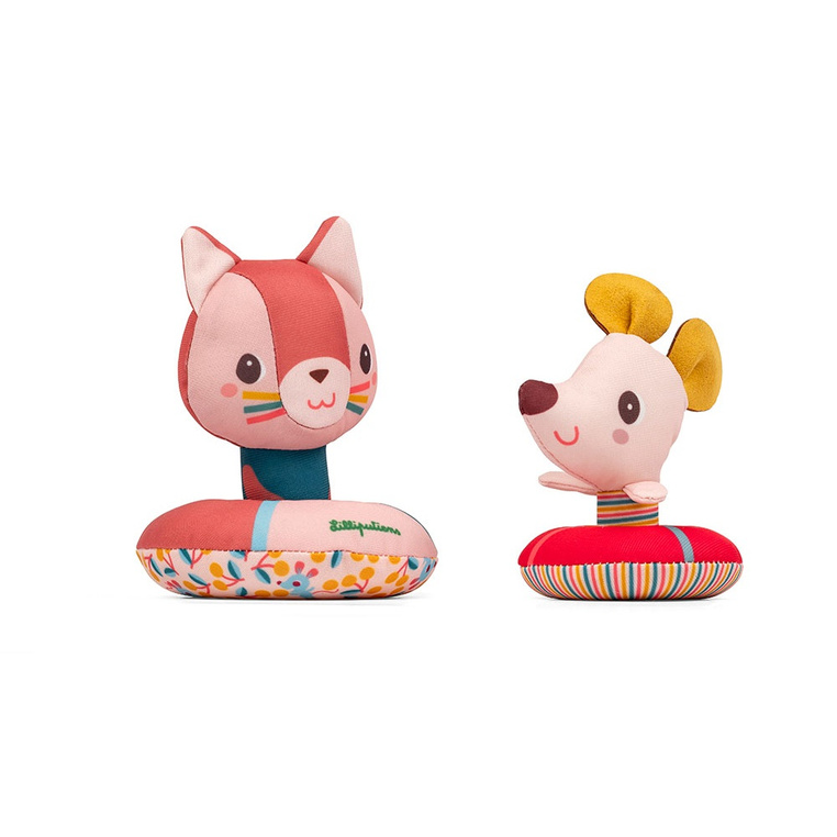 Zestaw dwóch przytulanek do kąpieli belgijskiej marki Lilliputiens: Kotka Jeanne i Myszka Nina, każda z własnym kołem do pływania. Wykonane zostały z miękkiego, łatwego do czyszczenia i szybkoschnącego materiału. Zabawki są perfekcyjnie wykończone, z dbałością o każdy szczegół i w pełni bezpieczne dla dziecka. Umilają czas spędzony w wannie, a przy okazji rozwijają sprawność motoryczną (chwyt, wkładanie i wyjmowanie z koła) oraz wyobraźnię (snucie opowieści).