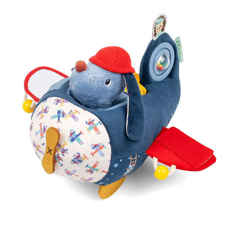 Przytulanka wielofunkcyjna Samolot z kolekcji Piesek Jules belgijskiej marki Lilliputiens to niebanalna, miękka i wielofunkcyjna zabawka, która wspiera dziecko w rozwoju i pobudza wyobraźnię. Ma postać pluszowego niebieskiego samolotu, którego pilotem jest uroczy Piesek Jules z elastyczną szyją i ukrytą w główce piszczałką. W samolocie znajduje się wiele aktywizujących elementów: bezpieczne lusterko na jednym ze skrzydeł, otwierane okienka odkrywające wnętrze maszyny, a także obracana grzechotka z kolorowymi kuleczkami. Dodatkowo są tu elementy o różnych fakturach, koralik do przesuwania, wyciągana walizka na sznureczku oraz naszywka z Jeżykiem Leonem, który jako mały pasażer ukrył się na pokładzie.