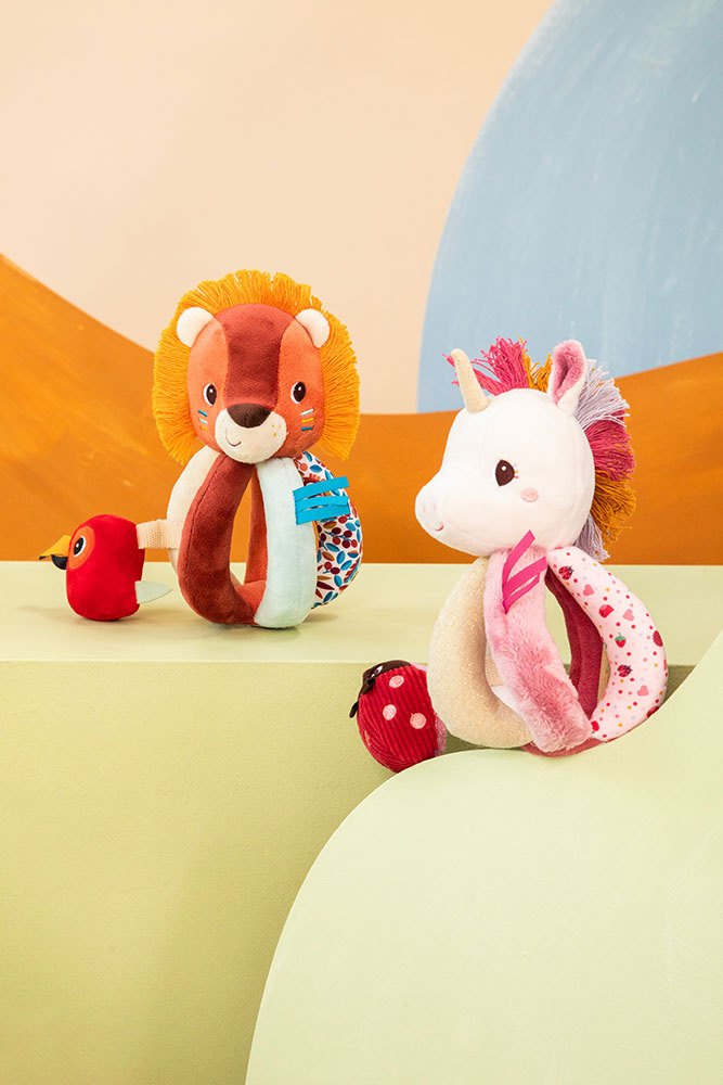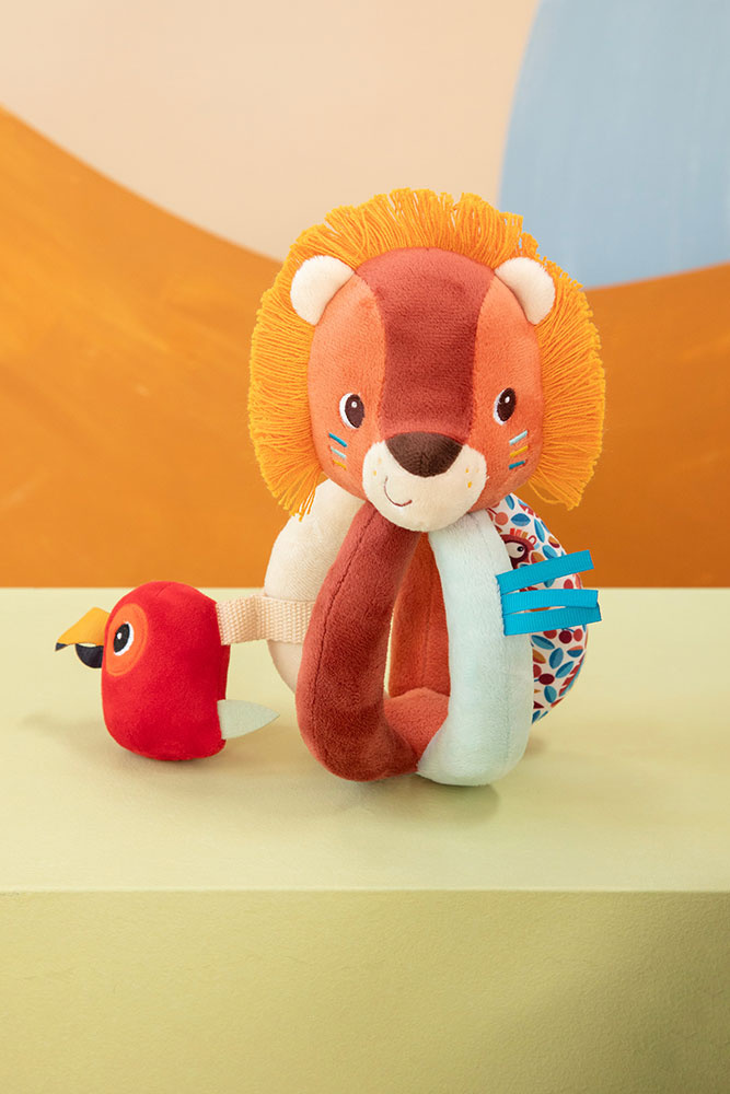 Grzechotka z uchwytami Lew Jack belgijskiej marki Lilliputiens to idealna zabawka aktywizująca dla niemowląt. Ma postać lwa z grzywą i ciałem, składającym się z pięciu poręcznych uchwytów wykonanych z różnorodnych tkanin. Dodatkowo jeden z nich szeleści przy pocieraniu, na innym znajdują się stymulujące sensorycznie wypustki, a na kolejnym zamocowana jest jeszcze jedna grzechotka – Papuga Gilles, którą można przekładać między uchwytami. Grzechotka umieszczona jest również w głowie lwa.