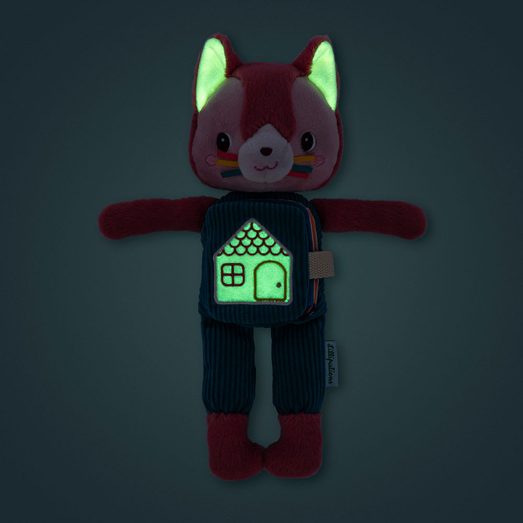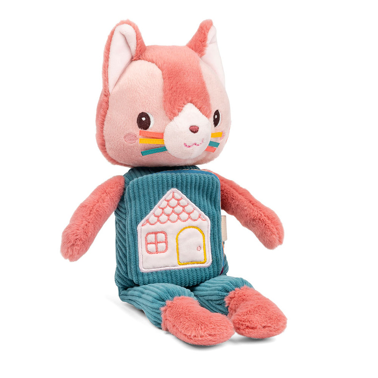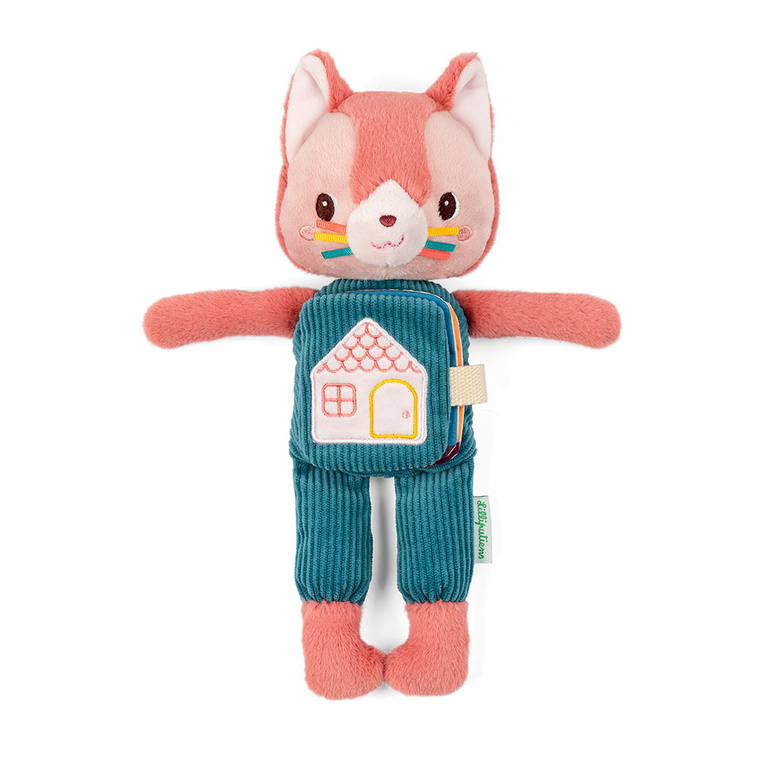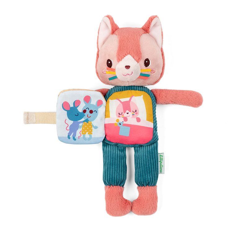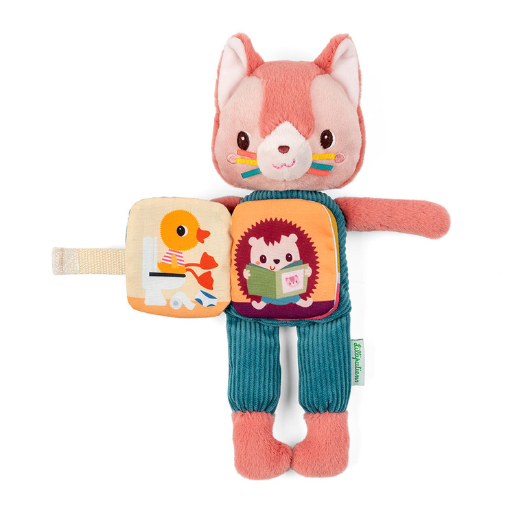 Książeczka-przytulanka aktywizująca Kotka Jeanne belgijskiej marki Lilliputiens to idealna pierwsza lektura i jednocześnie uroczy przyjaciel maluszka. Brzuszek kotki to miękka książeczka, na stronach której pojawiają się zwierzątka z ekipy Lilliputiens, m.in. Kaczorek Gaspard czy Piesek Jules, prezentujące swoją wieczorną rutynę przed snem – zakładanie piżamki, mycie ząbków czy buziak na dobranoc. Dodatkową atrakcją jest domek na pierwszej stronie oraz wnętrze kocich uszek, które świecą w ciemności. Dzięki fluorescencyjnym elementom Jeanne staje się doskonałą towarzyszką do zasypiania i świetną alternatywą dla lampki nocnej – delikatnie rozprasza mrok, daje dziecku poczucie bezpieczeństwa i ułatwia odnalezienie przytulanki w nocy.